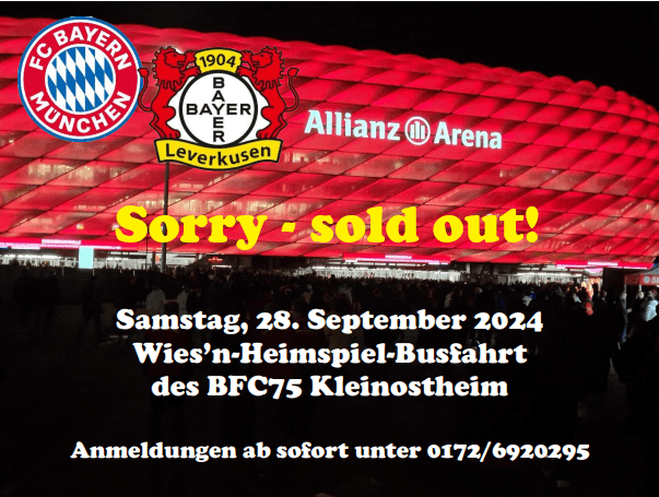 Unsere Wies’n-Heimspielfahrt am 28. September gegen Bayer 04 LEV ist ticketmäßig aktuell ausgebucht, Es stehen lediglich noch einige Plätze/ Mitfahrgelegenheiten für Ticketinhaber zur Verfügung!
